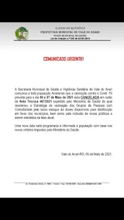 A secretária municipal de saúde e vigilância sanitária de Vale do Anari comunica a toda população anariese que a vacinação contra a Covid-19 prevista para o dias 06 e 07 de maio de 2021 está cancelada em razão da nota técnica 467/2021 expedida pelo mistério da saúde da qual reordenou A estratégia de vacinação dos grupos de pessoas com comodidade pelo baixo estoque de doses disponível para distribuição em favor dos municípios bem como pela inclusão de novos público a serem atendidos na fase atual.